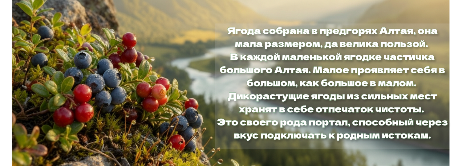 Ягода собрана в предгорьях Алтая, она мала размером, да велика пользой. В каждой маленькой ягодке частичка большого Алтая.