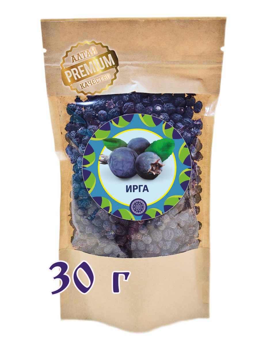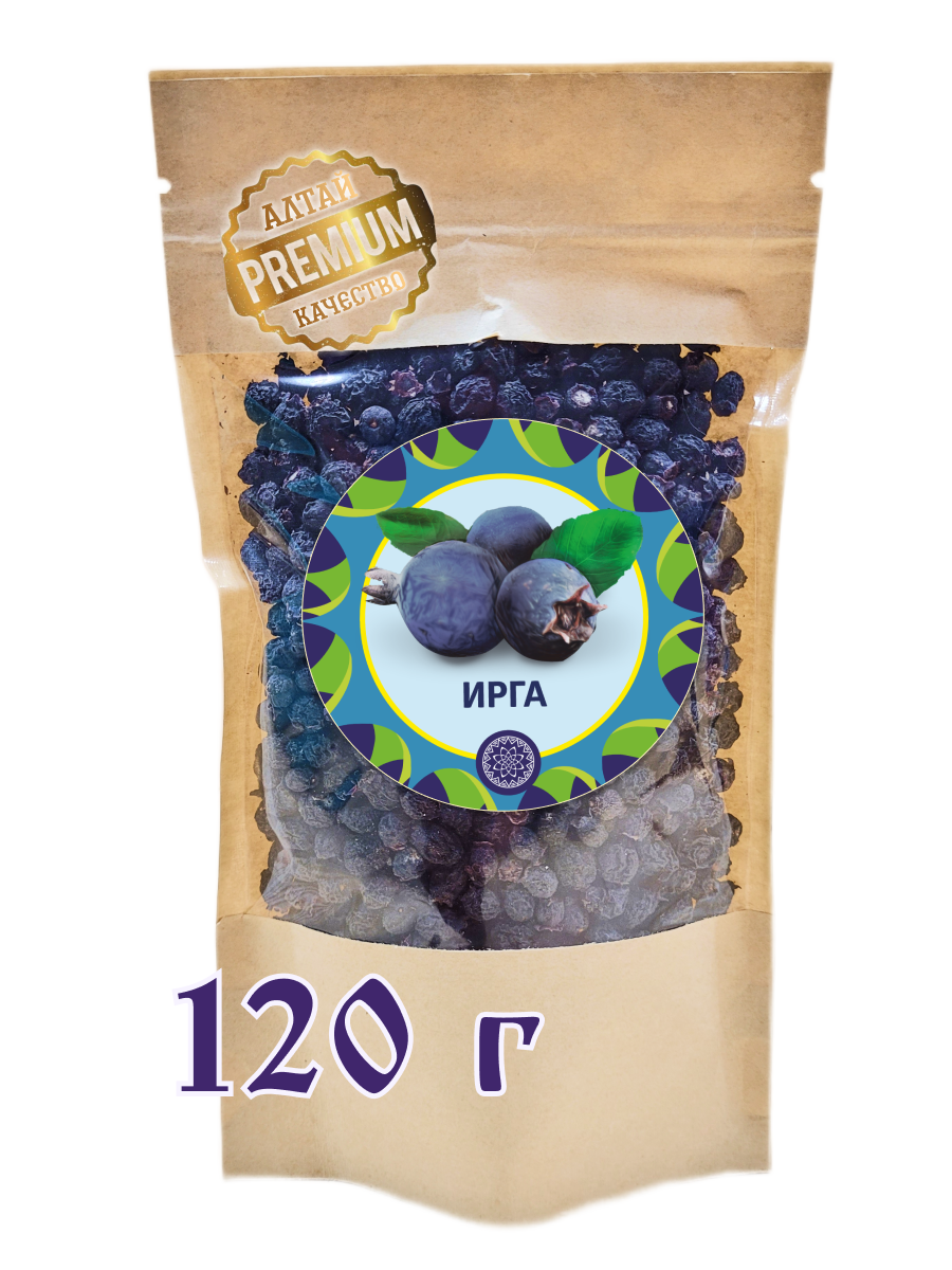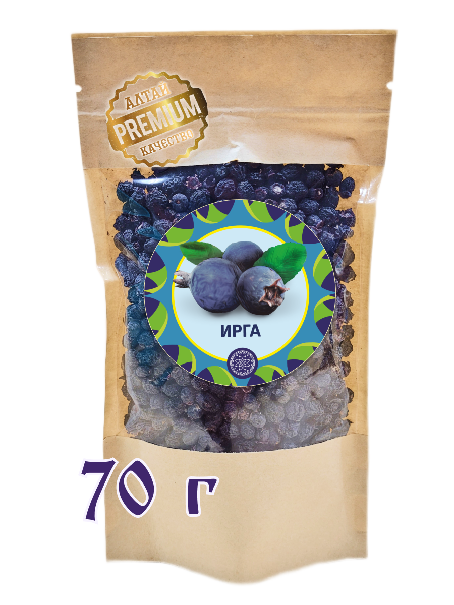 100% сушёная ирга. Плоды проходят щадящую сушку, позволяющую сохранить природную сладость, аромат и концентрацию биологически активных веществ. Сушёная ирга сохраняет упругую структуру, не слипается и подходит для употребления в чистом виде, а также для приготовления напитков и десертов.