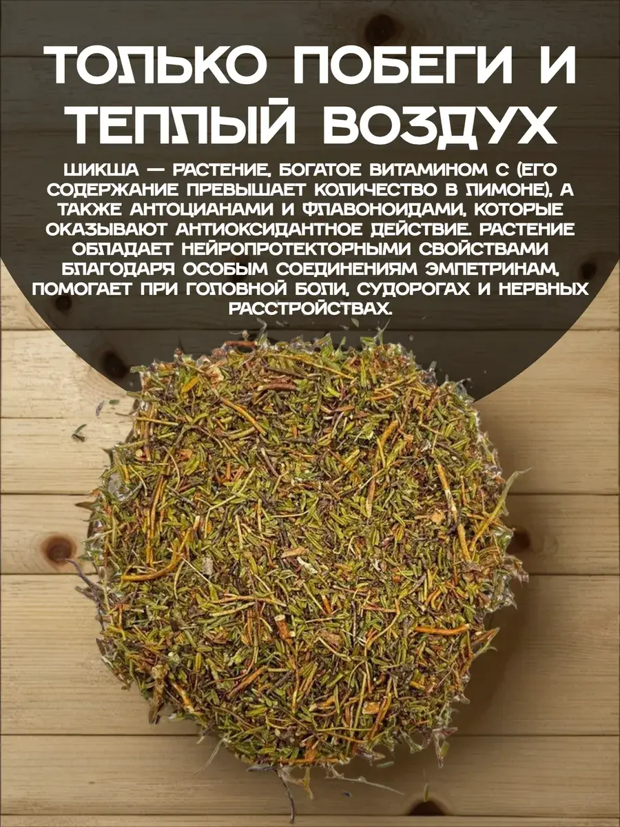 Шикша (или водяника) — удивительное северное растение, которое издавна ценится за свои целебные свойства. В упаковке содержится 100 грамм тщательно высушенных побегов растения, готовых к использованию.